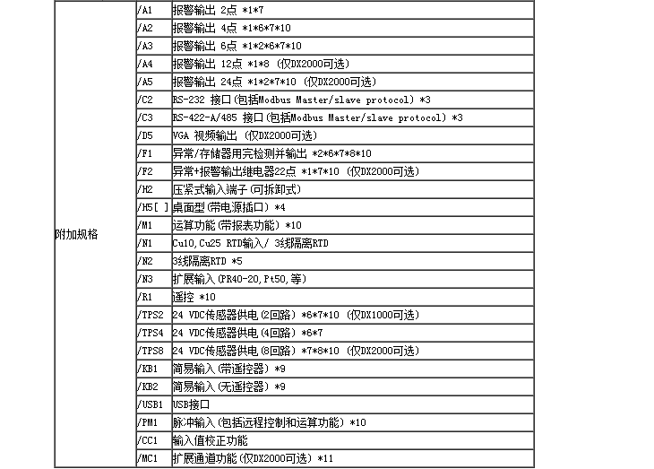 | *1 /A1,/A2,/A3,/A4,/A5以及/F2不能同時選用 *2 /A3和/F1不能同時選用(僅對DX100), /A5和/F1不能同時選用(僅對DX200) *3 /C2,/C3以及/CF1不能同時選用 *4 /H5[ ] D:電源插口 UL,CSA 標準 F:電源插口 VDE 標準 R:電源插口 SAA 標準 J:電源插口 BS 標準 H:電源插口 GB 標準 *5 DX1002,DX1004,DX2004,DX2008 不能選用/N2 *6 選用了/TPS2, 就不能選用 /TPS4, /A2, /A3或 /F1(僅對DX1000) *7 DX1000: 選用了/TPS4, 就不能選用 /TPS2, /A1, /A2, /A3或 /F1 DX2000: /TPS4, /TPS8, /A5, /F2不能同時指定 *8 選用了/TPS8, 就不能同時選用/F1和/A4 *9 /KB1, /KB2不能同時指定,指定/KB1時,附帶1臺遙控器(438227) *10 DX1000: 指定/PM1時,不能指定/A3, /M1, /R1, /TPS2, /TPS4。另外/A2, /F1不能同時指定 DX2000: 指定/PM1時,不能指定/A5, /F2, /M1, /R1。另外/A2, /F1和/A4, /TPS8不能同時指定 *11 只能對DX2010,DX2020,DX2030,DX2040,DX2048指定/MC1 |