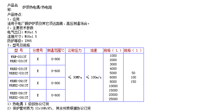 WRN-0313T,WRN2-0313T,WREK-0313T,WREK2-0313T,爐頂熱電偶/熱電阻