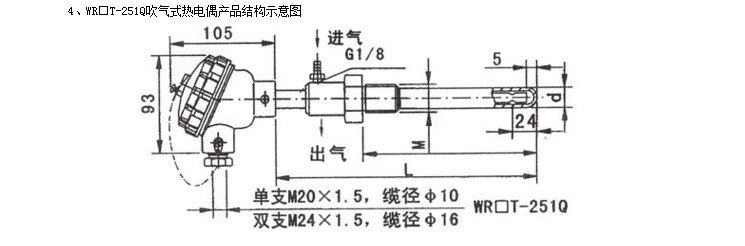 K分度號(hào)吹氣式熱電偶,M27×2螺紋安裝,熱電偶外徑為Ф16mm,熱電偶接線盒為大空腔接線盒,內(nèi)裝鎧裝熱電偶芯子,總長(zhǎng)L*插深l=700*550mm