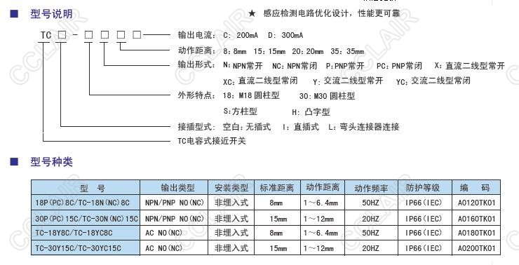 18P(PC)8C/TC-18N(NC)8C,30P(PC)15C/TC-30N(NC)15C,TC-18Y8C,TC電容式接近開關