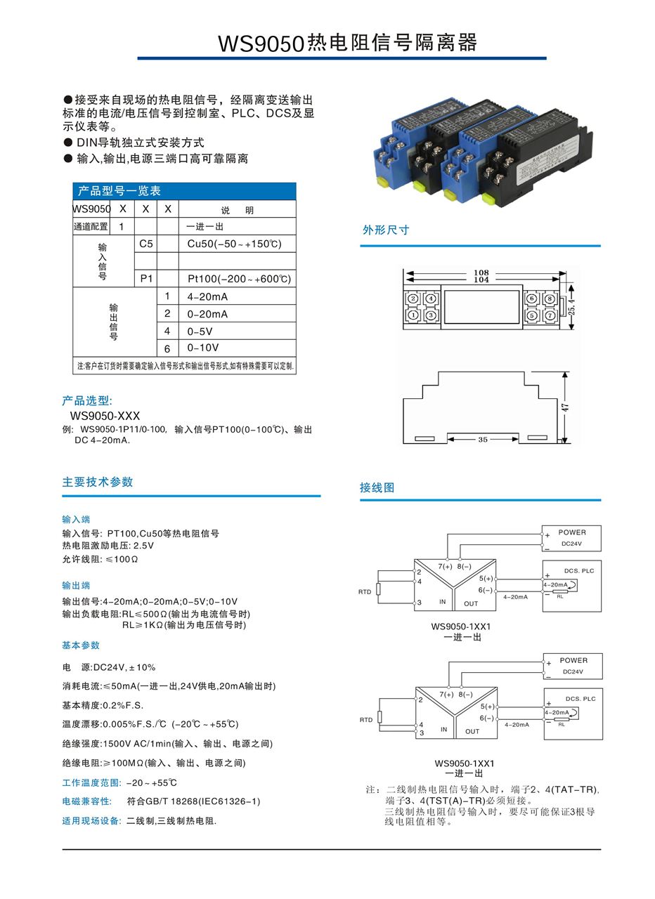 WS9050熱電阻信號(hào)溫度變送器,接受來(lái)自現(xiàn)場(chǎng)的熱電阻信號(hào),經(jīng)隔離變送輸出標(biāo)準(zhǔn)的電流/電壓信號(hào)到控制室、PLC、DCS及顯示儀表等,輸入、輸出、電源三端口隔離,DINT型導(dǎo)軌安裝