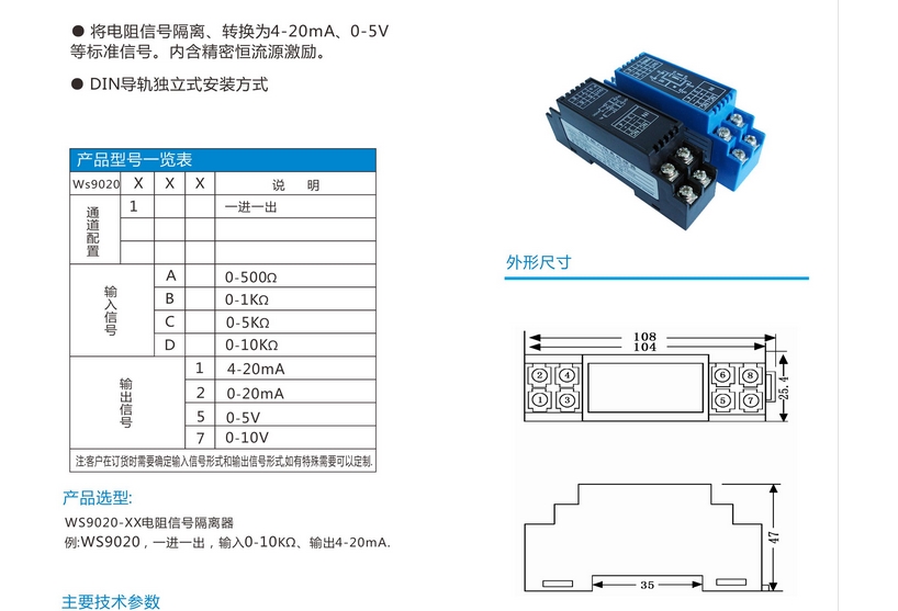 WS9020電阻信號(hào)隔離器,變送器,內(nèi)含精密恒流源激勵(lì),將電阻位置信號(hào)轉(zhuǎn)換為過(guò)程信號(hào),輸入、輸出、電源三端口隔離, DIN T型導(dǎo)軌安裝