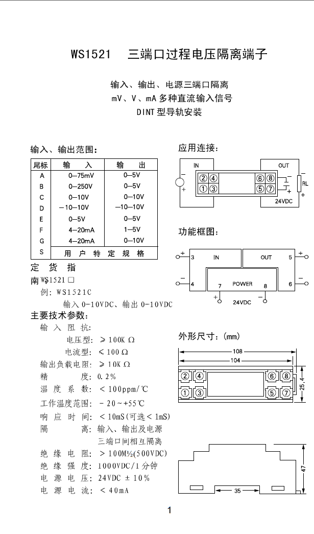 WS1521三端口直流電壓隔離變送器,隔離端子。輸入、輸出、電源三端口隔離,高低電壓、高低信號多種直流信號輸入,DIN T型導(dǎo)軌安裝