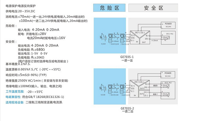 GE703S系列防爆安全柵4-20mA 隔離式安全柵 檢測端安全柵, 將輸入信號檢測端4-20mA變換為相互隔離的信號,低功耗,低熱量,低漂移,DIN T型導軌安裝