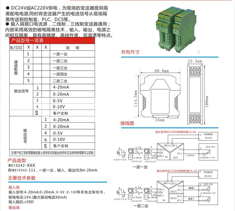 WS15242全隔離輸出信號分配器,配電器,安全隔離柵,信號隔離器模塊,安全柵,電流轉(zhuǎn)換模塊。將輸入信號變換為兩路相互隔離的信號,低功耗,低漂移,DIN T型導(dǎo)軌安裝,默認(rèn)DC24V電源,AC220V.