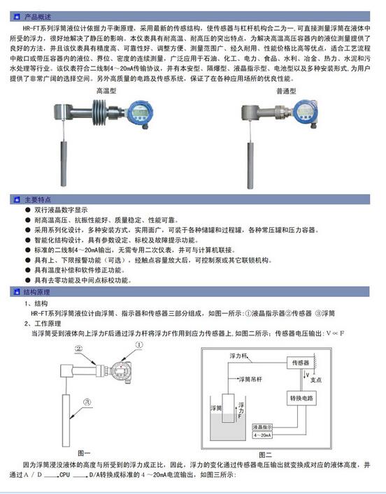 HR-FT系列浮筒液位計依據力平衡原理,采用最新的傳感結構,使傳感器與杠桿機構合二為一,可直接測量浮筒在液體中所受的浮力,很好地解決了靜壓的影響。本儀表具有耐高溫、耐高壓的突出特點,為解決高溫高壓容器內的液位測量提供了良好的方法,并且該儀表具有精度高、可靠性好、調整方便、測量范圍廣、經久耐用、性能價格比高等優(yōu)點