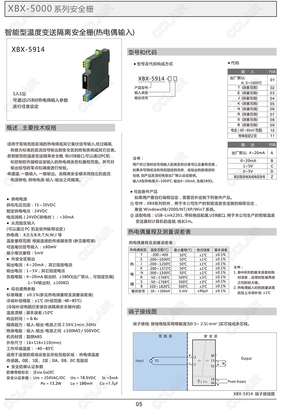 XBX-5914,XCX-5914-02C,XCX-5914-03C,XCX-5914-04C,智能型溫度變送隔離安全柵(熱電偶輸入)(一入一出)