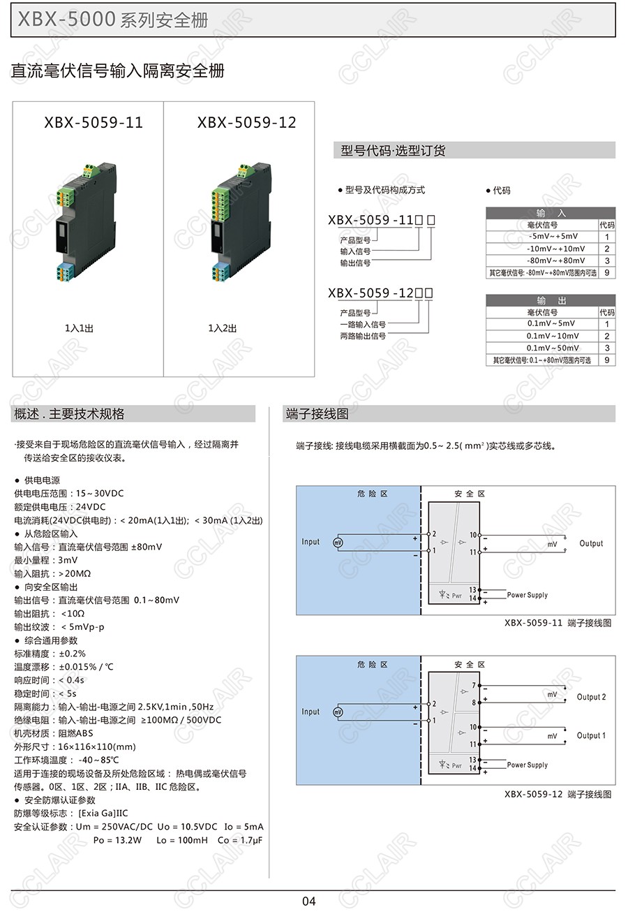 XBX-5059-11,XBX-5059-12,XBX-5059-11-22,XBX-5059-11-33,XBX-5059-11-99,直流毫伏信號(hào)隔離安全柵(一入一出、一入二出)