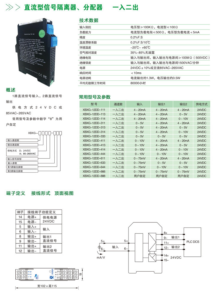 XBXG-12DD,XBXG-12DD-111,XBXG-12DD-113,XBXG-12DD-114,直流信號隔離器、分配器(一入二出)