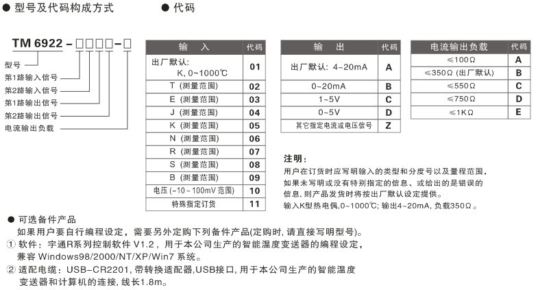 是智能型的溫度變送器, 有 USB 編程接口, 可以使用專用的編程電纜連接這個溫度變送器和PC機, 通過軟件在PC機上進行編程, 可以任意編程設定熱電偶分度號和測量溫度的量程范圍。