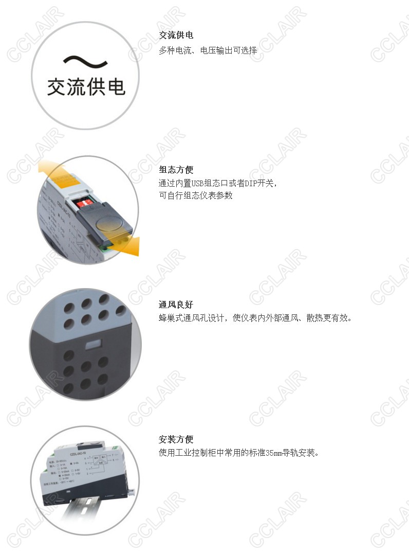 小巧的外殼結(jié)構(gòu),35mm標(biāo)準(zhǔn)導(dǎo)軌安裝方式,多種電流、電壓輸出可選擇。