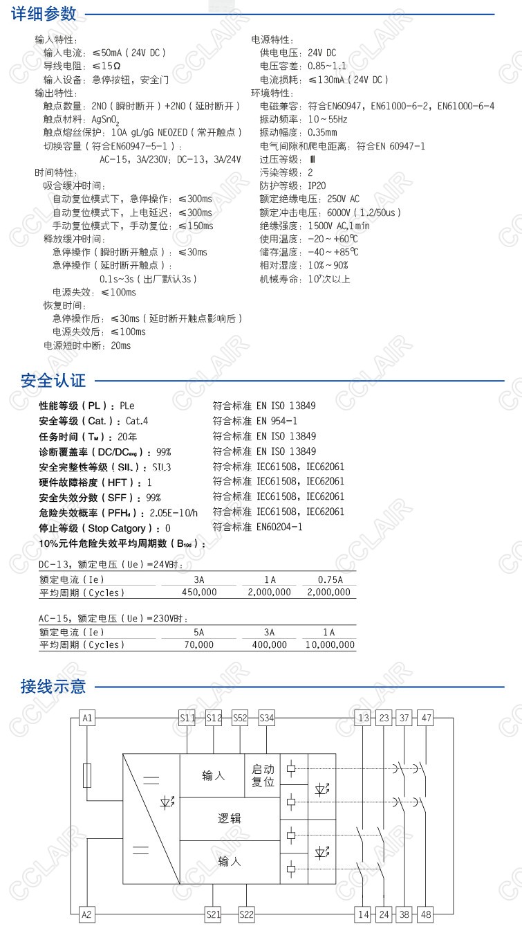 CZSR8002-2A2AT是適用于急停按鈕、安全門(mén)控開(kāi)關(guān)輸入,具有2路NO(常開(kāi))安全輸出觸點(diǎn)(瞬時(shí)斷開(kāi))和2路NO(常開(kāi))輔助輸出觸點(diǎn)(延時(shí)斷開(kāi))的安全繼電器。它可選擇單、雙通道操作,手動(dòng)或自動(dòng)復(fù)位,并具有通道間短路監(jiān)控功能。