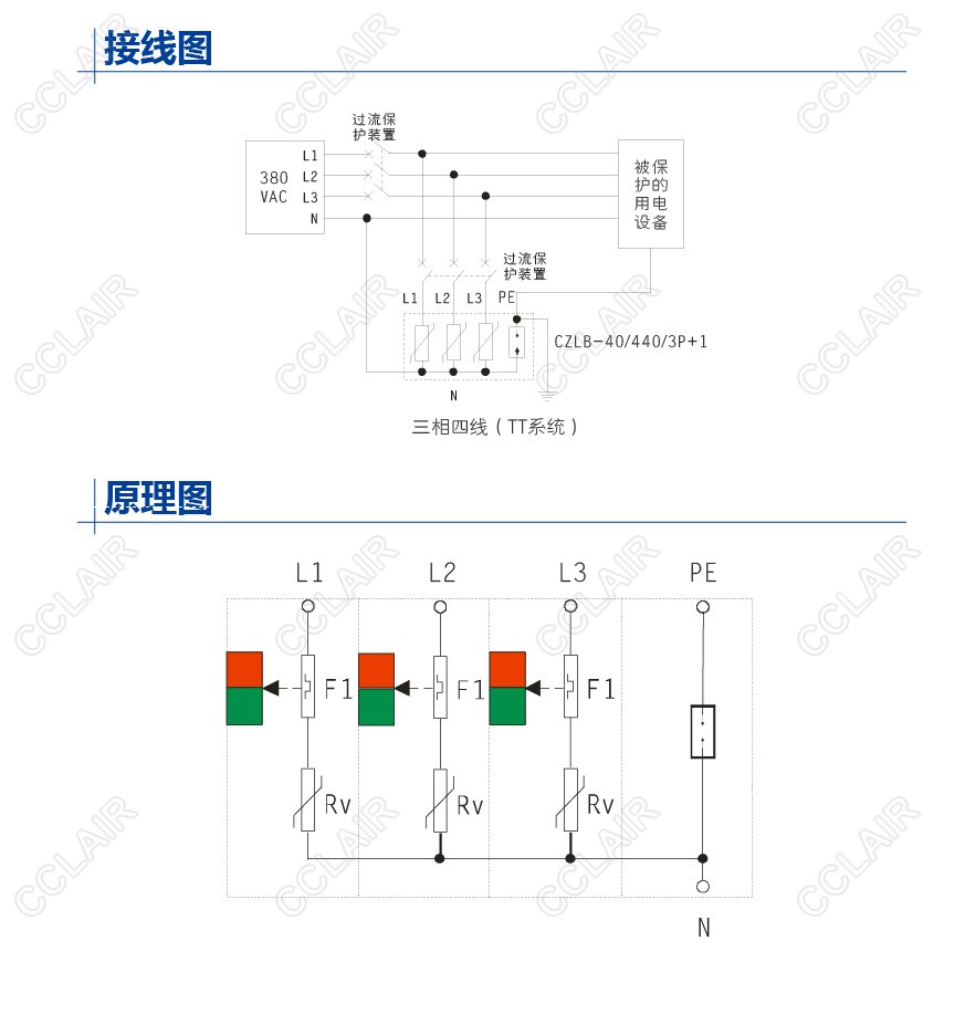 交流電源型SPD,40kA(8/20us),適合220/380VAC電源單相TT系統(tǒng),安裝于防雷分區(qū)LPZ1與LPZ2