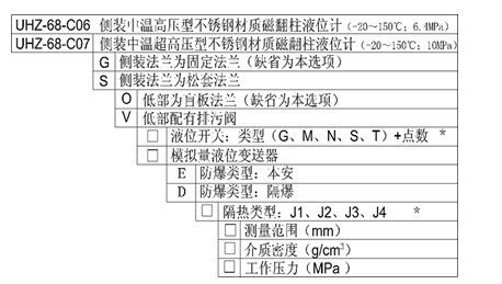 UHZ-68-C06磁翻柱液位計是中溫高壓型側裝式磁翻柱液位計,壓力等級為6.4MPa;UHZ-68-C07是中溫 超高壓型側裝式磁翻柱液位計,壓力等級為10MPa。