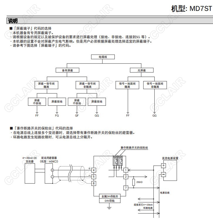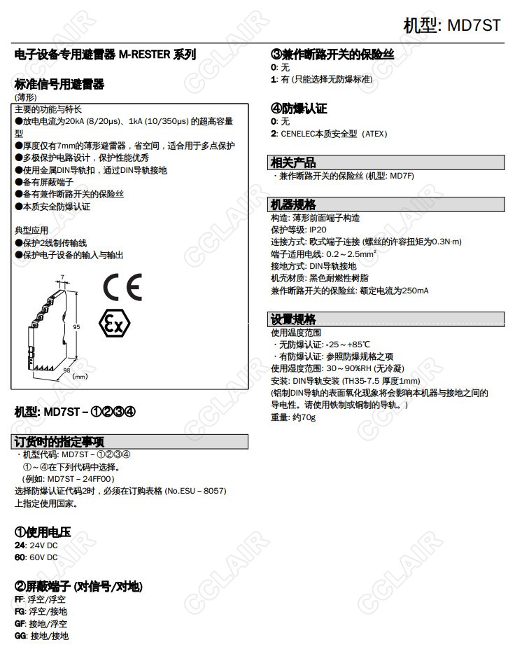 MD7ST,MD7ST-24FF00,MD7ST-24FF,MD7ST-60FF,MD7ST-24FG,MD7ST-60FG,4-20mA直流、脈沖信號用 超薄型避雷器