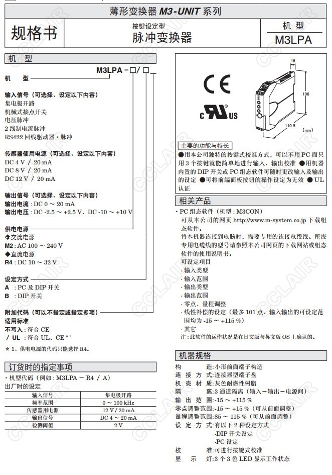M3LPA,M3LPA-M2/A,M3LPA-M2/A/UL,M3LPA-M2/B,M3LPA-M2/B/UL,脈沖變換器(按鍵設(shè)定型)