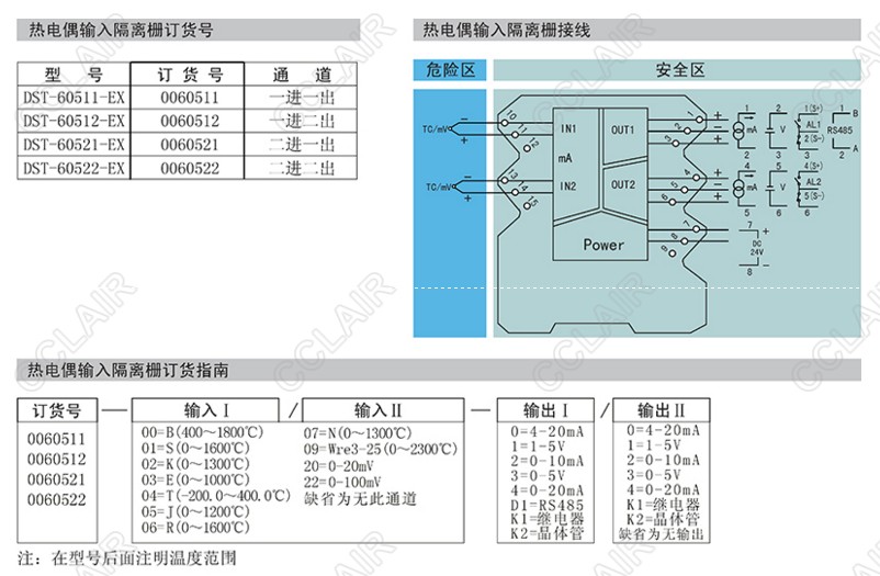 本產(chǎn)品將來自危險(xiǎn)的熱電偶、毫伏信號(hào)轉(zhuǎn)換成電壓、電流、RS485信號(hào)或開關(guān)量信號(hào),從危險(xiǎn)區(qū)隔離傳送到安全區(qū),該產(chǎn)品需獨(dú)立供電。