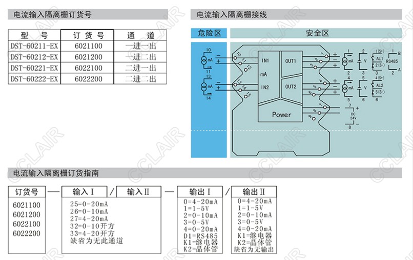 本產(chǎn)品給危險區(qū)的電流信號轉(zhuǎn)換成電壓、電流、RS485信號或開關(guān)量信號,從危險區(qū)隔離傳送到安全區(qū),該產(chǎn)品需獨立供電.