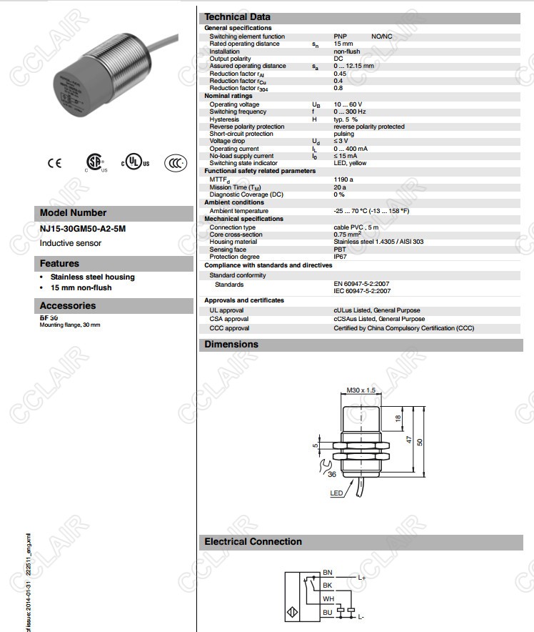 NJ15-30GM50-A2-5M,電感式接近開關(guān)