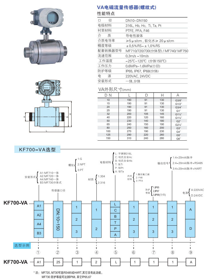 KF700-VA-A1-10,KF700-VA-A1-15,KF700-VA-A1-20,KF700-VA-A1-25,KF700-VA-A1-32,KF700-VA-A1-40,螺紋式電磁流量傳感器