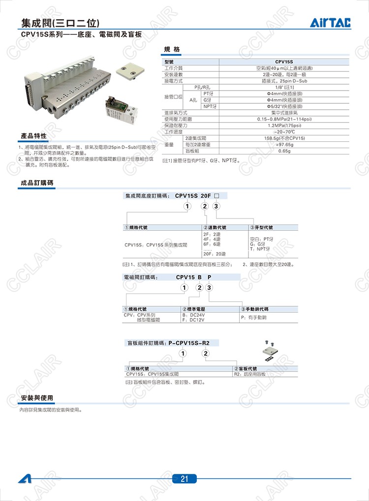 CPV15SB2F,CPV15SB2FG,CPV15SB2FT,CPV15SF11F,CPV15SF11FG,CPV15SF11FT,AIRTAC集成閥