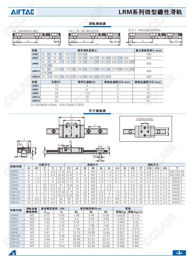 亞德客AIRTAC,LRM5N,LRM5L,LRM7N,LRM7L,LRM9N,LRM9L,LRM12N,LRM12L,LRM15N,LRM15L,微型線性滑軌