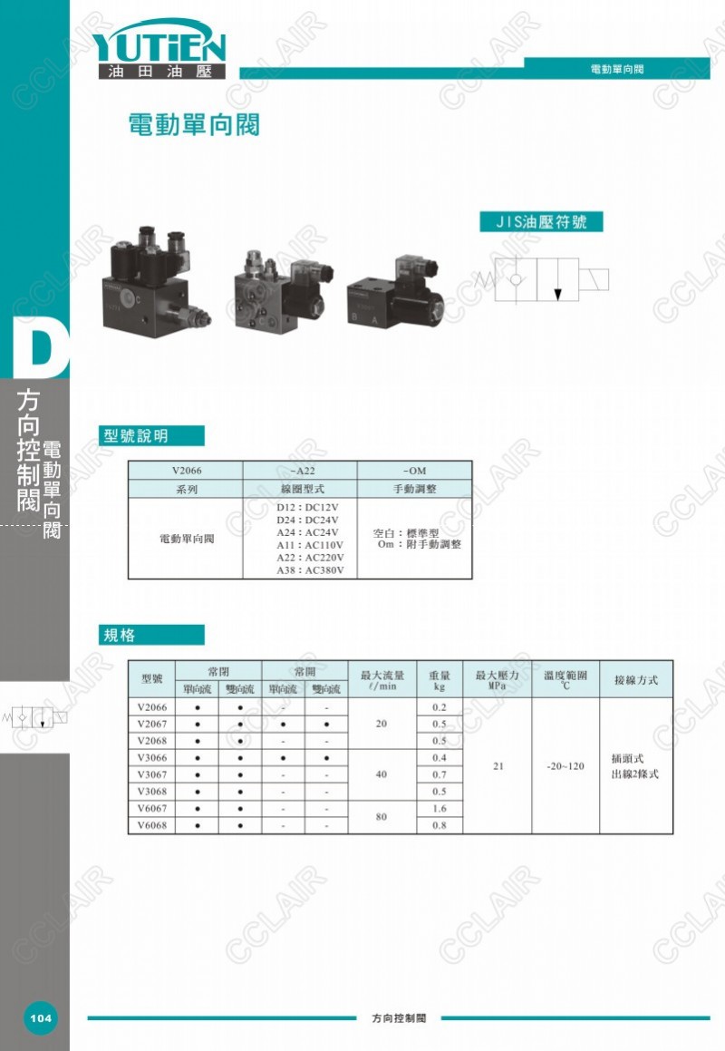 YUTIEN油田電動(dòng)單向閥V2066,V2067,V2068,V3066,V3067,V3068,V6067,V6068
