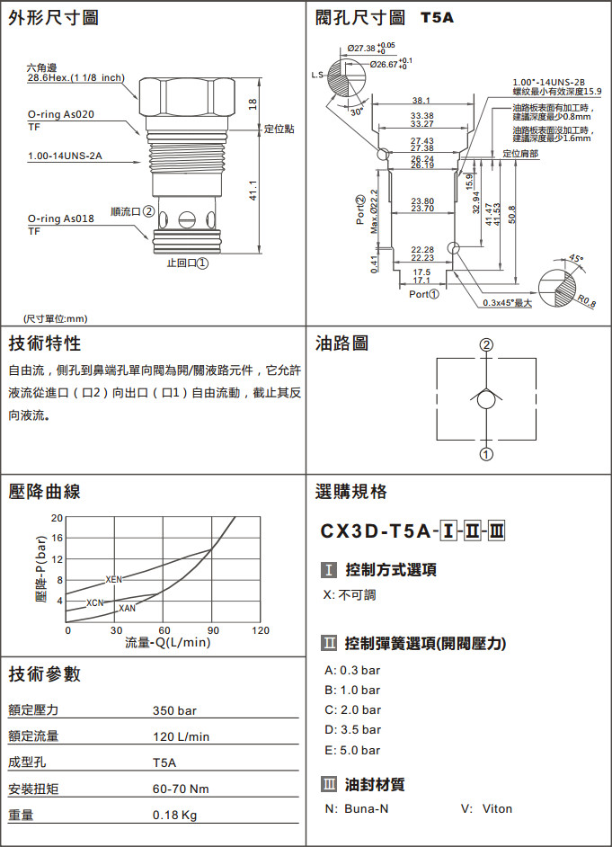 CX3D-T5A-XAN,CX3D-T5A-XBN,CX3D-T5A-XEN,CX3D-T5A-XCV,CX3D-T5A-XCN,CX3D-T5A-XDN,CX3D-T5A-XAV,CX3D-T5A-XBV,CX3D-T5A-XDV,CX3D-T5A-XEV,單向閥(口2通口1自由流)