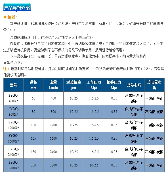 SYGQ-400x50,SYGQ-800x80,SYGQ-1200x100,SYGQ-1600x125,SYGQ-2400x150,SYGQ-3200x200,雙聯(lián)油過濾器