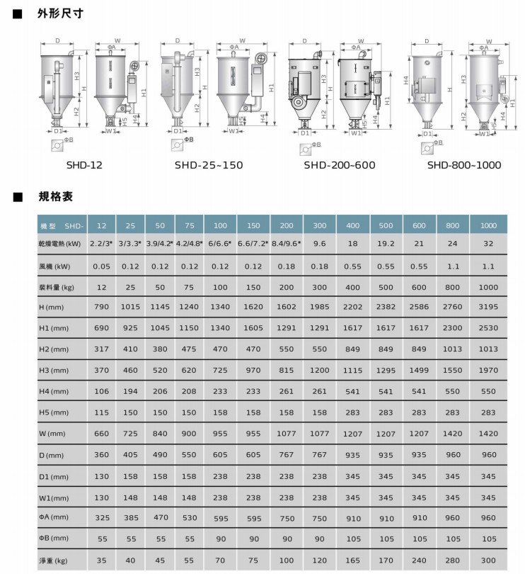 SHD-12,SHD-25,SHD-50,SHD-75,SHD-100,SHD-150,SHD-200,SHD-300,SHD-400,SHD-500,SHD-600,SHD-800,SHD-1000料頭干燥機