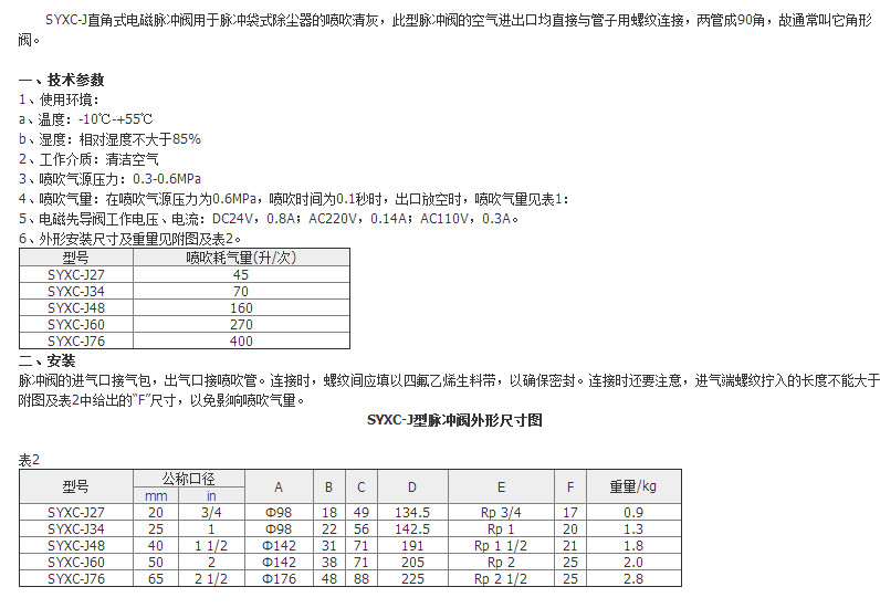 電磁脈沖閥SYXC-J27,SYXC-J34,SYXC-J48,SYXC-J60,SYXC-J76,