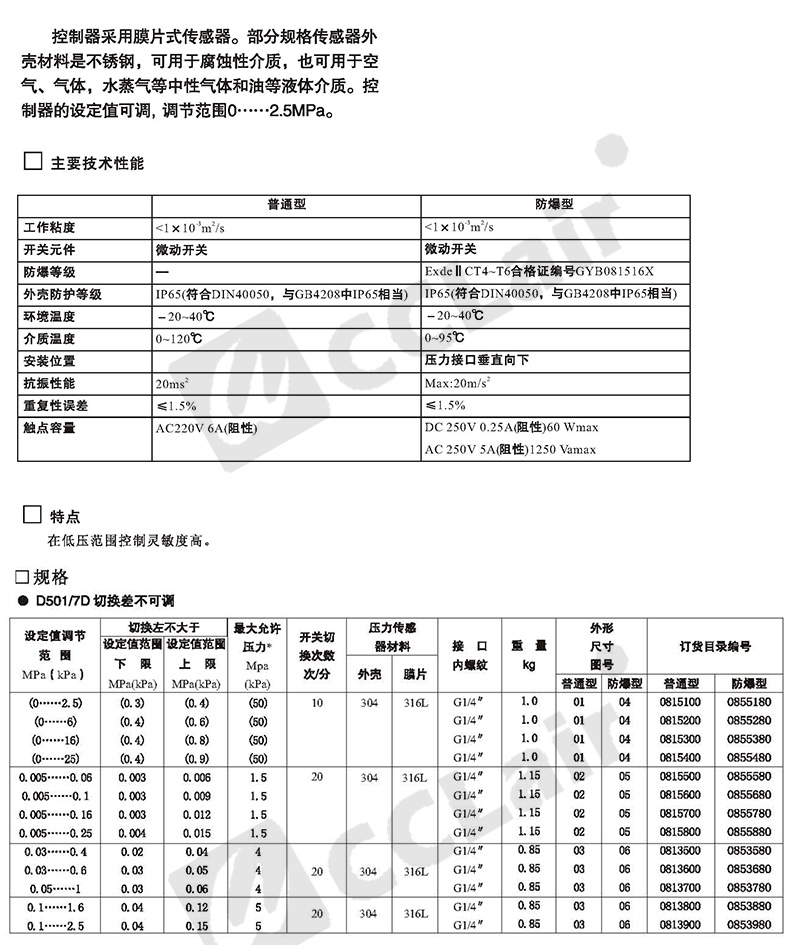 0821051 G1/4,0821077 G1/4,0821050 G1/4,壓力控制器 D505/8D切換差不可調(diào)