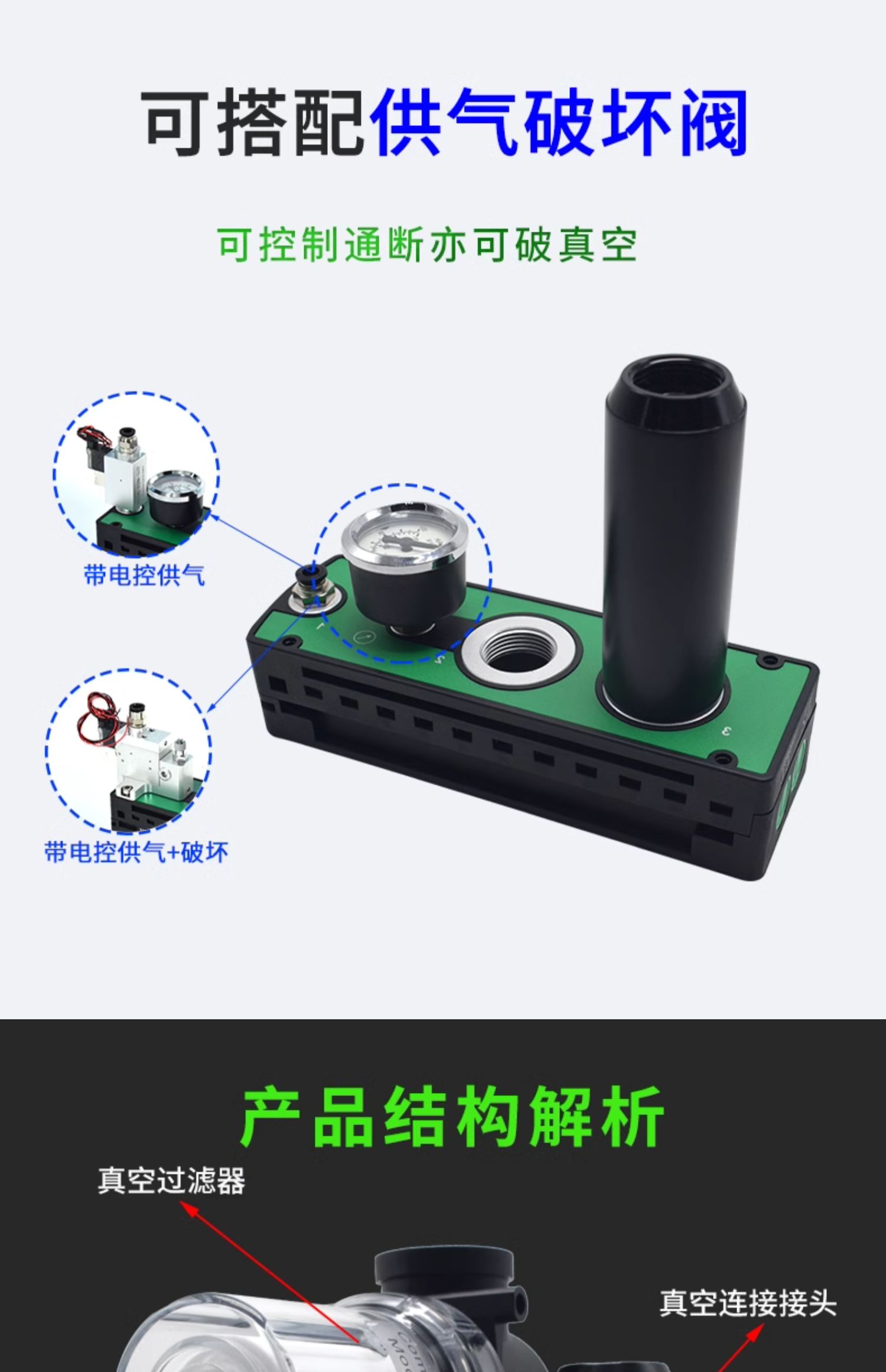 多級(jí)高真空型發(fā)生器的工作原理是利用噴管高速噴射壓縮空氣,?在噴管出口形成射流,?產(chǎn)生卷吸流動(dòng)。?這種工作原理使得噴管出口周圍的空氣不斷地被抽吸走,?從而使吸附腔內(nèi)的壓力降至大氣壓以下,?形成一定真空度。