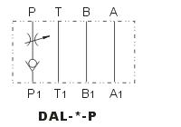 DAL型疊加式節(jié)流單向閥,它是單向閥和節(jié)流閥串聯(lián)組合的一種節(jié)流單向閥,它的作用是只允許油液?jiǎn)畏较蛲ㄟ^并用節(jié)流閥進(jìn)行流量調(diào)節(jié),而反向則截止。