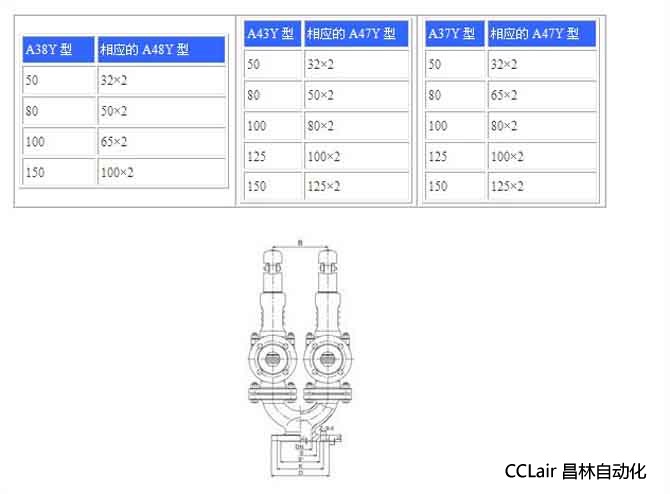 A38Y彈簧雙聯(lián)式安全閥、A43H彈簧雙聯(lián)式安全閥、A37H彈簧雙聯(lián)式安全閥是在Y型接頭上裝設兩個同樣規(guī)格的A48Y或A47H型安全閥而構成,其公稱通徑系列指Y型接頭進口通徑,其組合情況如下表: