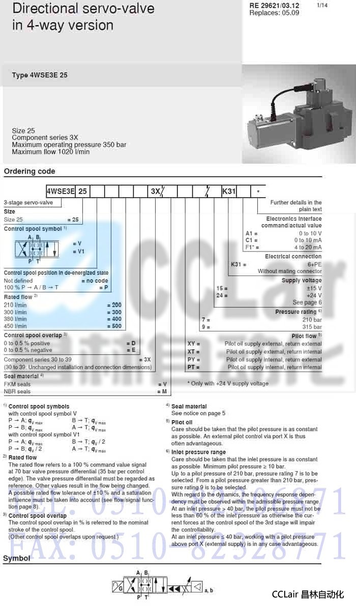 4WSE3E25V500D3X/VXY9/24K31C1,4WSE3E25V500D3X/VPT9/15K31A1, 方向伺服閥,力士樂REXROTH,德國(guó)力士樂