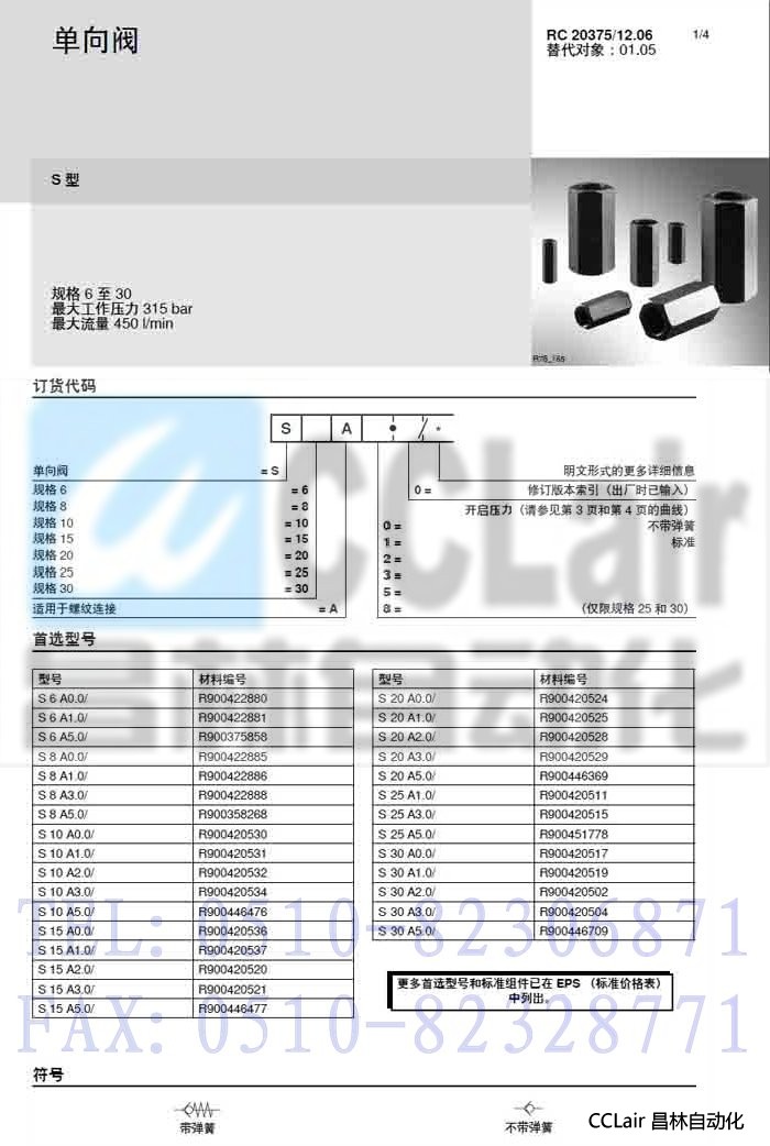 S25A5.0/ R900451778,S30A0.0/ R900420517,S30A1.0/ R900420519,,單向閥,力士樂REXROTH,德國力士樂 |
