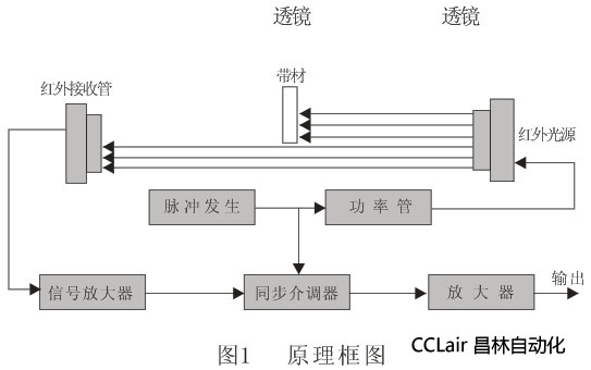 原理框見圖一,紅外光源發(fā)出高頻光脈沖,射出一束平行光,由紅外光敏接收管,接收并經(jīng)過信號放大器,轉(zhuǎn)變成電脈沖信號。當(dāng)光路上有帶材,遮擋時,光信號的強(qiáng)弱便發(fā)生變化,這個變化經(jīng)同步介調(diào)和放大后,變成電壓信號輸出。