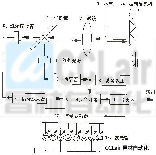 原理框圖見下圖,紅外光源(1)發(fā)出高頻光脈沖,通過半透鏡(2)透鏡(3)射出一束平行光,經(jīng)定向反光板(5)反射后沿原路返回到傳感器內(nèi),由紅外光敏接收管(6)接收并經(jīng)過信號放大器(9)轉(zhuǎn)變成電脈沖信號。當(dāng)光路上有帶材(4)遮擋時,光信號的強弱便發(fā)生變化,這個變化經(jīng)同步介調(diào)和放大后,變成電壓/電流標(biāo)準信號輸出。