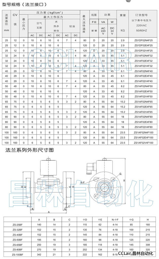 ZS-25BF,ZS-32BF,ZS-40BF,ZS-50BF,不銹鋼法蘭二位二通零壓差電磁閥(常閉型)ZS-65BF,ZS-80BF,無錫昌林,ZS-100BF,