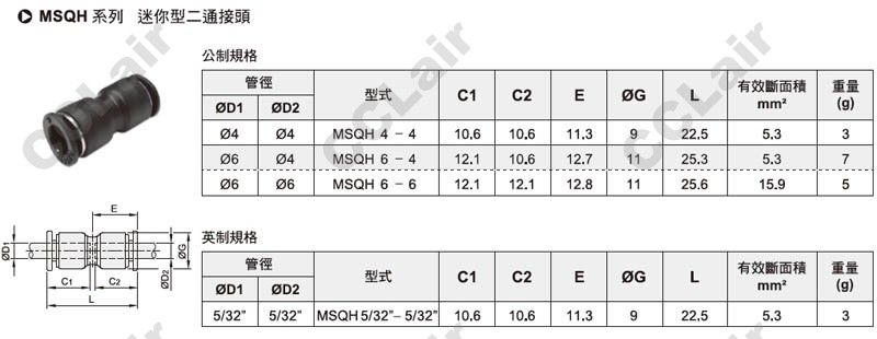氣立可(chelic),MSQH4-4,MSQH6-6,MSQH6-4,MSQH5/32-5/32,迷你型二通接頭