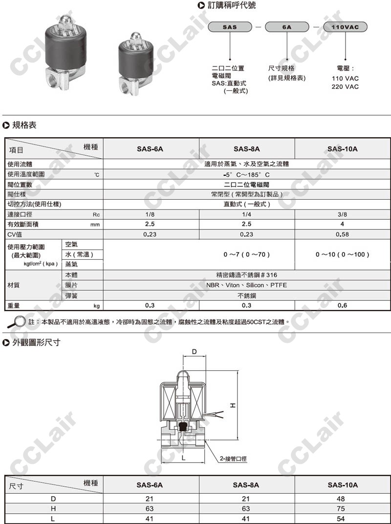 氣立可(chelic),SAS-6A-110VAC,SAS-8A-110VAC,SAS-10A-110VAC,SAS-6A-220VAC,電磁閥 |