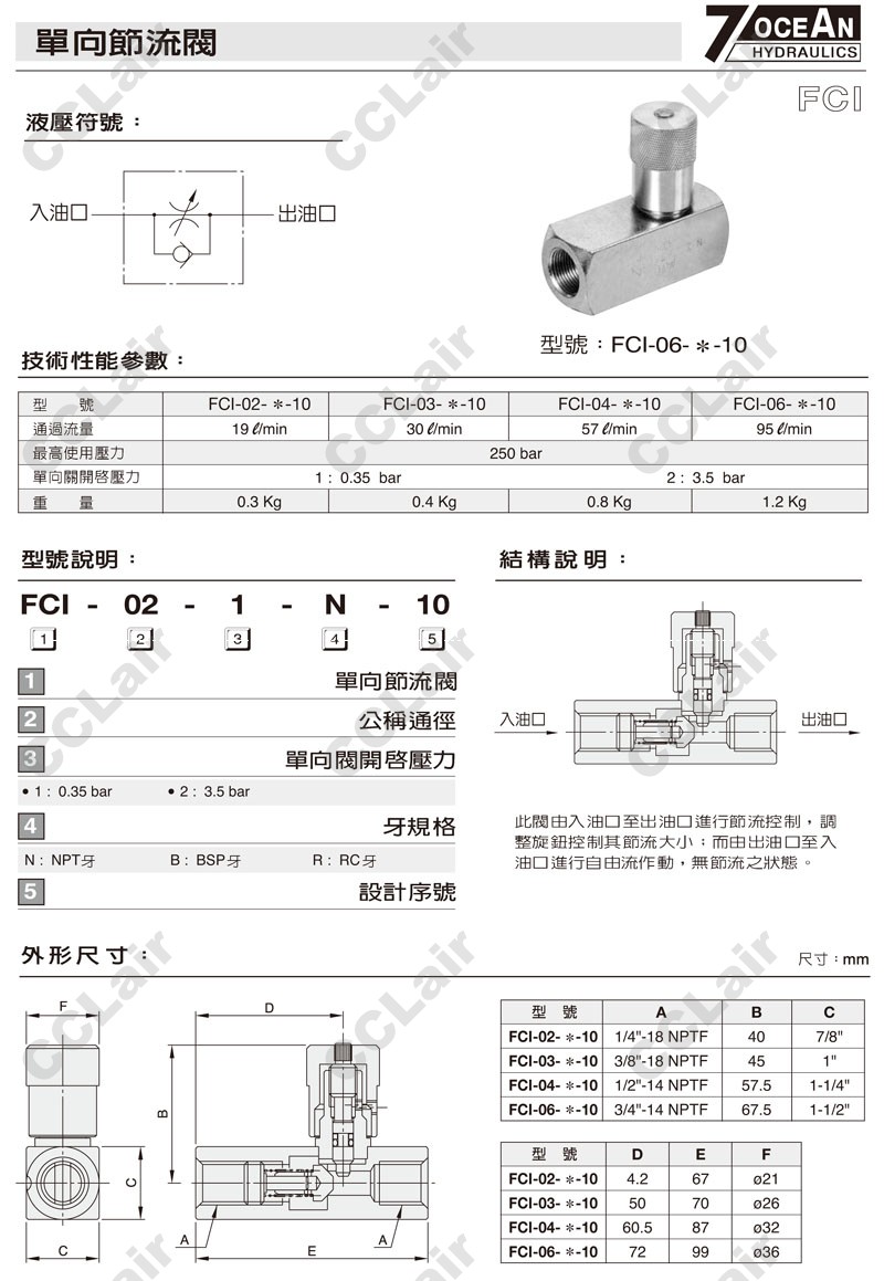 FCI-02-1,FCI-02-2,FCI-02-2-B-10,FCI-02-1-N-10,FCI-02-2-R-10,7OCEAN七洋單向節(jié)流閥 |