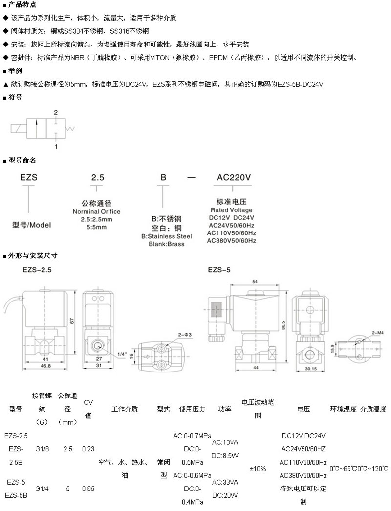 EZS-2.5,EZS-2.5B,EZS-5,EZS-5B,二位二通活塞式電磁閥