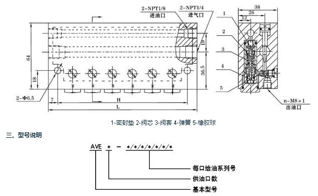| ZRAVE型油氣分配混合器,它是一種由鋁合金材料制造的容積定量式結構的油氣分配混合器,設有一個進油口、一個進氣口、1~8個油氣出口。主要適用于單線卸壓式油氣潤滑系統(tǒng)中。 |
