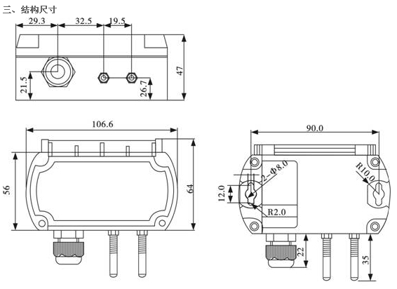 一、概述 KH-804型壓力變送器由進口微小量程,高穩(wěn)定性能傳感器和高可靠性信號處理IC電路構(gòu)成,有更好的抗干電磁干擾和浪涌電流能力。 二、技術(shù)指標(biāo) l 量程范圍:0-100Pa~100KPa; -100~0KPa l 測壓形式:表壓(G)、負(fù)壓(N)、差壓(C) l 補償溫度:-10~70℃ 工作溫度:-20~85℃ l 綜合精度:0.1%、0.25%、0.5%、1% l 輸出選擇:4~20mA、0~10mA、1~5V、0~5VDC l 電源電壓:15VDC、24VDC l 測量介質(zhì):無腐蝕性氣體
