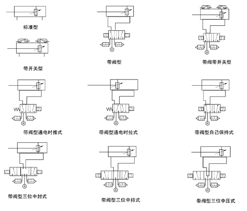| 通電時活塞桿伸出式 | 通電時活塞桿返回式 | 自己保持式 | 中封式 | 中泄式 | 中壓式 | ||