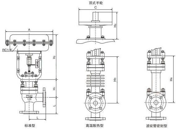 標準型-17~+230℃、散熱型+230~+450℃、低溫型-60~-196℃、波紋管密封型-40~+350℃