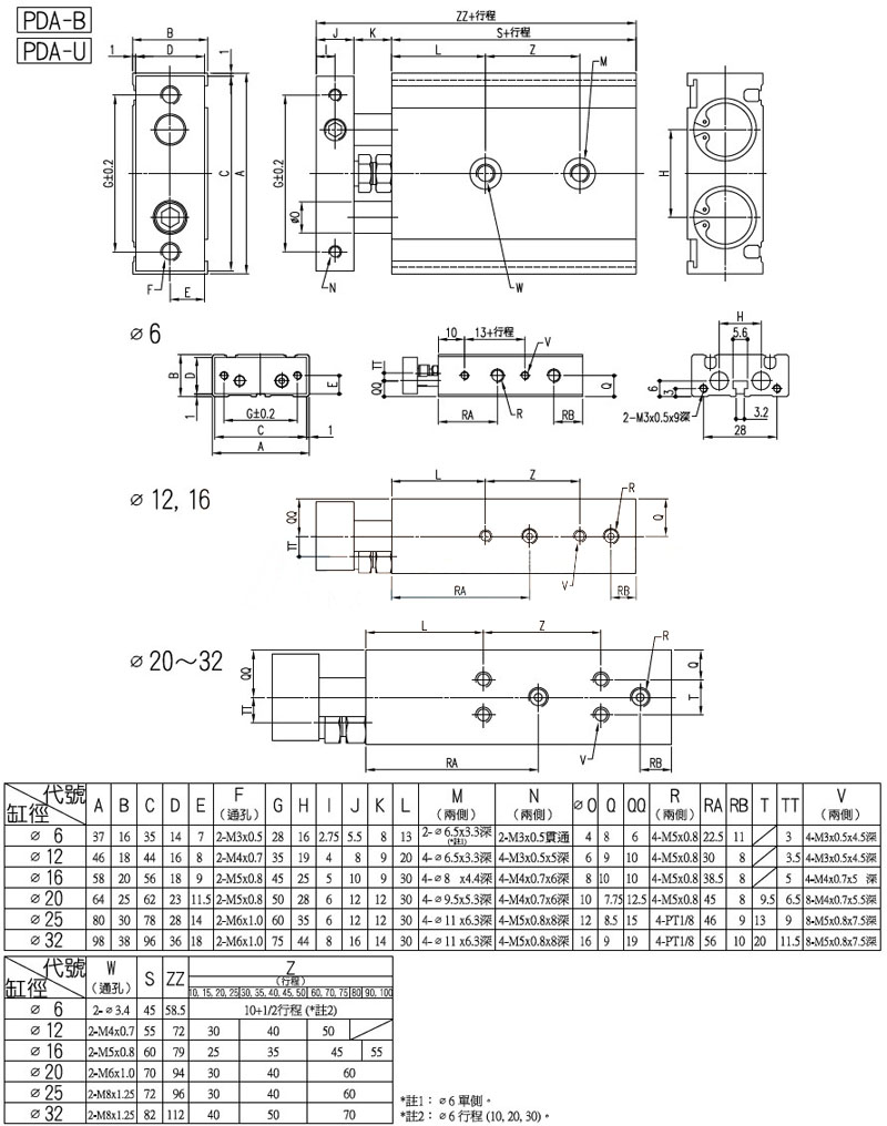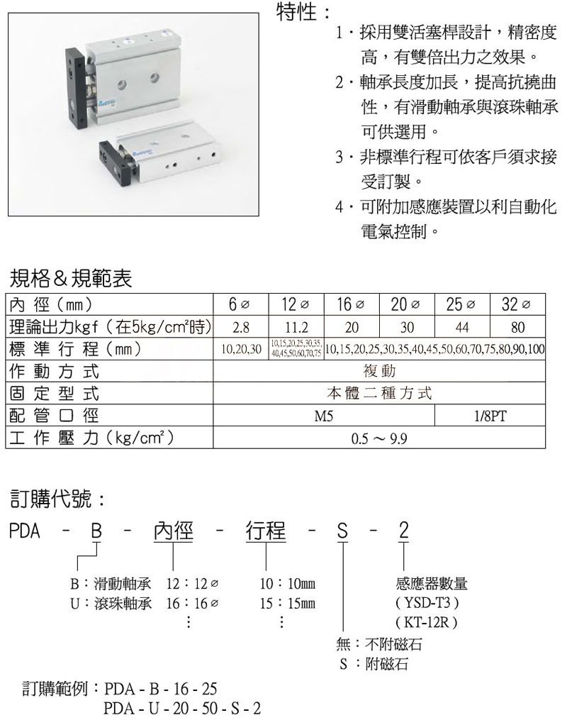 PDA-B-6,PDA-B-12,PDA-B-20,PDA-U-6,PDA-U-12,PDA-U-20,panix軸承式雙軸缸 |