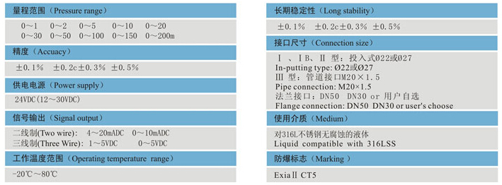 YD322-II液位變送器由全密封隔離膜充油液位傳感器和儀表專用電路組成,具有測(cè)量精度高、穩(wěn)定性好、壽命長(zhǎng)、安裝方便等優(yōu)點(diǎn)。采用獨(dú)特的工藝密封結(jié)構(gòu)形式,防滲漏性能好,長(zhǎng)期浸入液體中工作可靠。